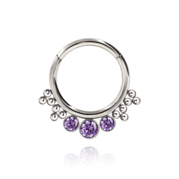 Kółko typu clicker wykonane z tytanu wysokopolerowanego ASTM F-136 z trzema kryształkami fioletowymi – środkowy ma 3 mm średnicy a dwa po bokach 2,5 mm.
