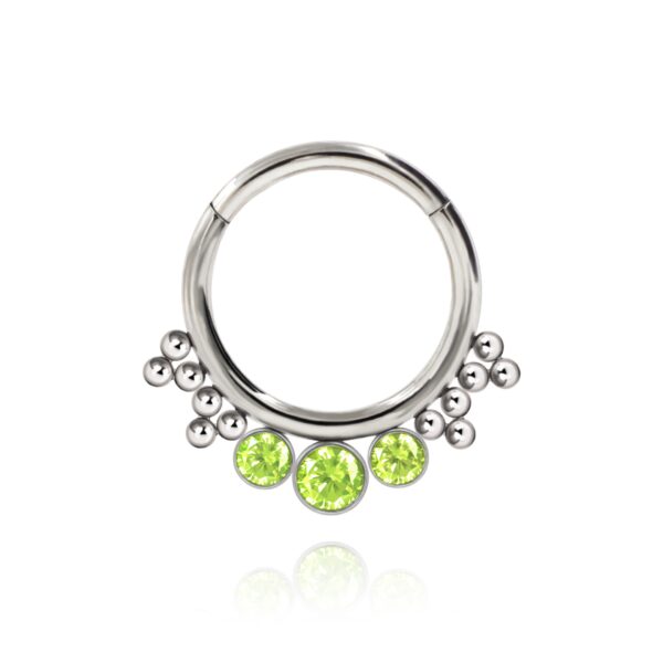 Kółko typu clicker wykonane z tytanu wysokopolerowanego ASTM F-136 z trzema kryształkami jasnozielonymi – środkowy ma 3 mm średnicy a dwa po bokach 2,5 mm.