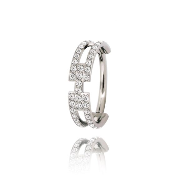 Kółko typu clicker wykonane z tytanu wysokopolerowanego ASTM F-136 z bezbarwnymi kryształkami w trzech rzędach / segmentach. Środkowy segment ma najmniej kryształków – w rozmiarze 8 mm są to cztery kryształki , 10 mm to pięć kryształków a 12 mm posiada sześć kryształków.