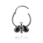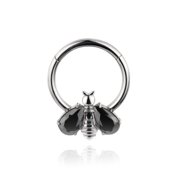 Kolczyk typu clicker z ozdobą pszczoły z czarnym kryształkami. Wykonany z tytanu wysokopolerowanego ASTM F-136.