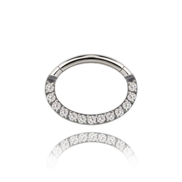 Kolczyk typu clicker w kształcie owalu z bezbarwnymi kryształkami wykonany z tytanu wysokopolerowanego ASTM F-136.
