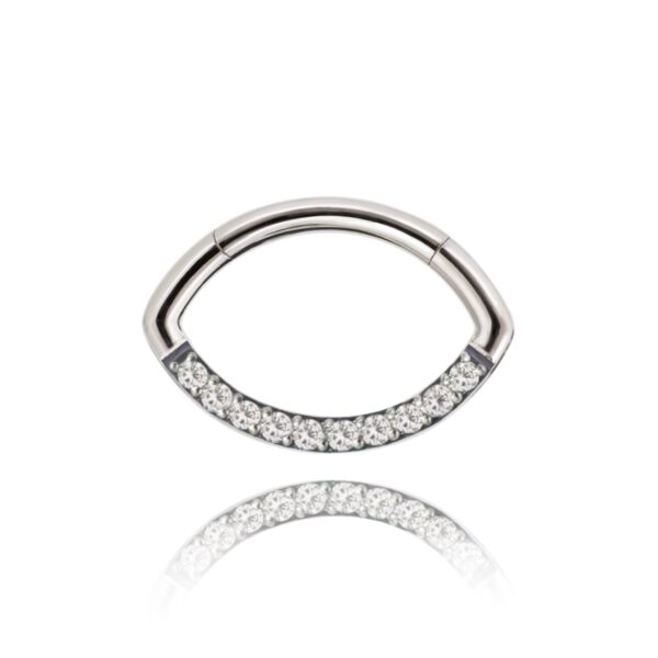 Kolczyk typu clicker w kształcie owalu z bezbarwnymi kryształkami wykonany z tytanu wysokopolerowanego ASTM F-136.