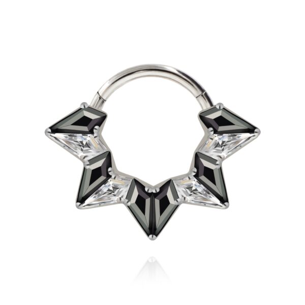 Kółko typu clicker wykonane z tytanu wysokopolerowanego ASTM F-136 z dziesięcioma kryształkami : sześcioma czarnymi i czterema bezbarwnymi.