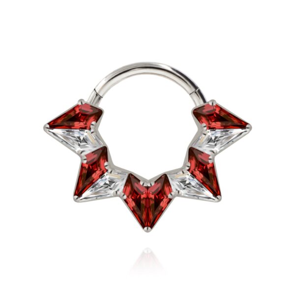 Kółko typu clicker wykonane z tytanu wysokopolerowanego ASTM F-136 z dziesięcioma kryształkami : sześcioma czerwonymi i czterema bezbarwnymi.