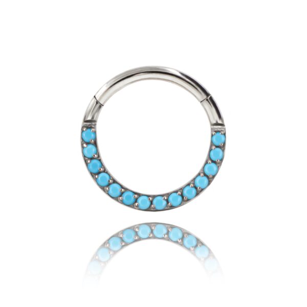Kolczyk typu clicker wykonany z tytanu wysokopolerowanego ASTM F-136. Kolczyk ma czternaście kamyczków – Turkus.