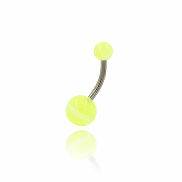 Kolczyk do pępka wykonany z tytanu G23 z akrylowymi kulkami w kolorze jaskrawo-żółto-białym.