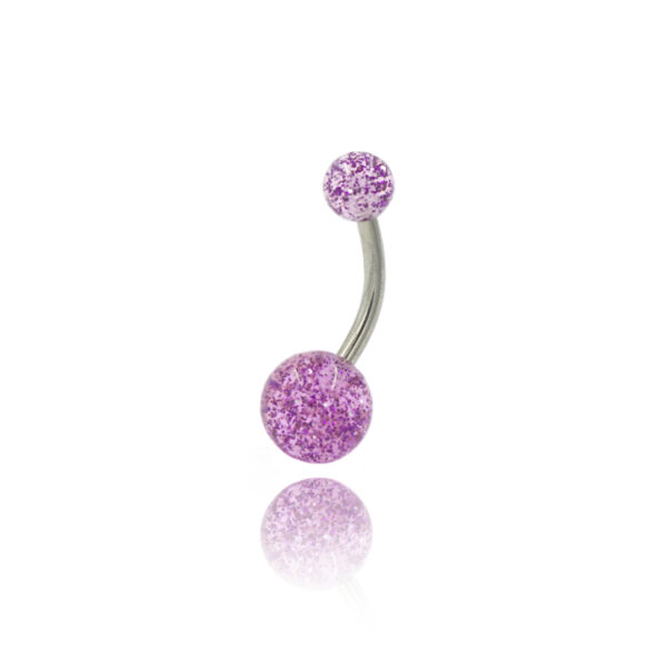 Kolczyk do pępka wykonany ze stali chirurgicznej 316L z akrylowymi kulkami brokatowymi w kolorze fioletowym.