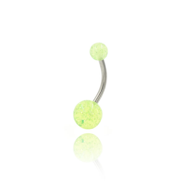 Kolczyk do pępka wykonany ze stali chirurgicznej 316L z akrylowymi kulkami brokatowymi w kolorze jaskrawozielonym.