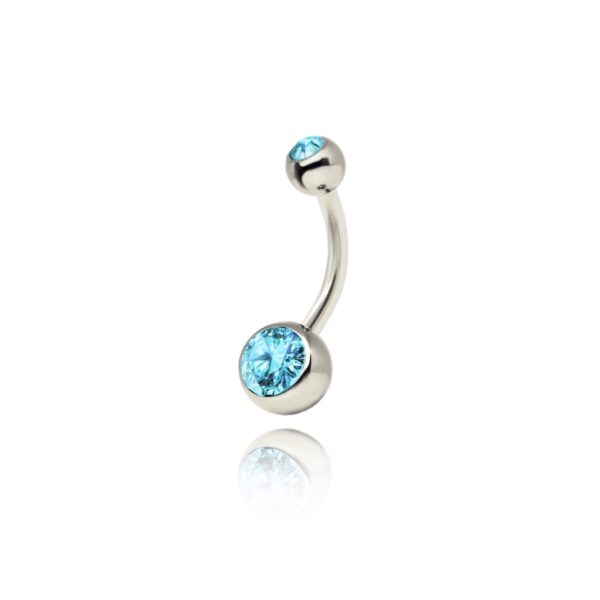 Kolczyk do pępka wykonany z tytanu z ozdobnymi kryształkami w kolorze błękitnym.