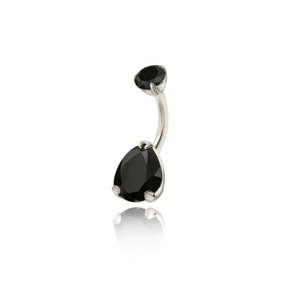 Kolczyk do pępka wykonany z tytanu z ozdobnymi, czarnymi kryształkami osadzonymi w tytanowej koronie. Dolna nakrętka w kształcie dużej łezki jest przymocowana na stałe.