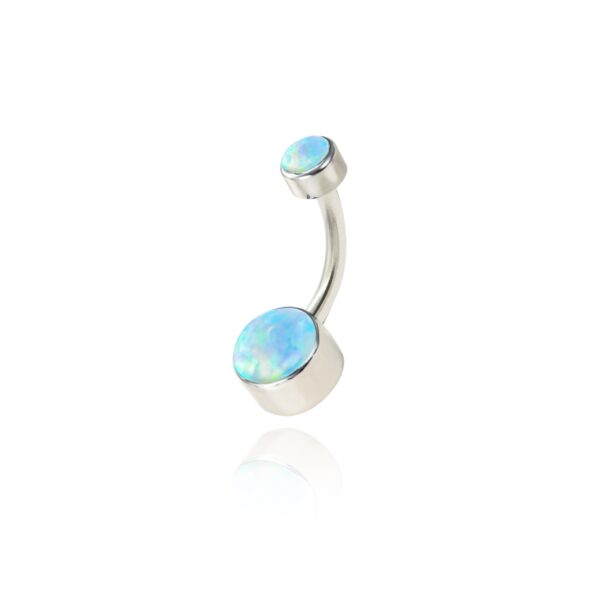 Kolczyk do pępka wykonany z tytanu z ozdobnymi opalitami w kolorze błękitnym.