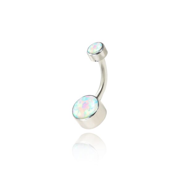 Kolczyk do pępka wykonany z tytanu z ozdobnymi opalitami w kolorze jasnym.