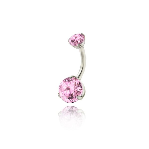 Kolczyk do pępka wykonany z tytanu z ozdobnymi, różowymi kryształkami osadzonymi w tytanowej koronie.