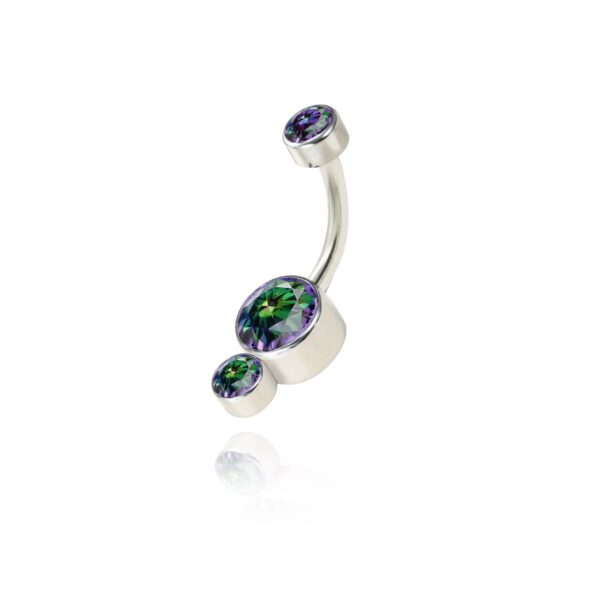 Kolczyk do pępka wykonany z tytanu z ozdobnymi, witrażowymi kryształkami.
