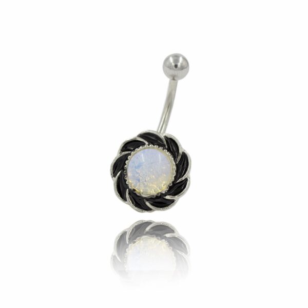 Kolczyk do pępka wykonany ze stali chirurgicznej 316L z ozdobą w kształcie kwiatu z osadzonym w środku opalitem.