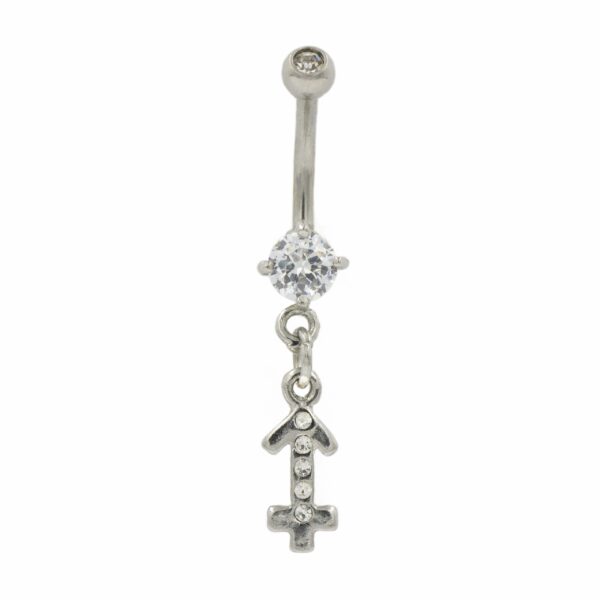 Kolczyk do pępka wykonany ze stali chirurgicznej 316L z wiszącą ozdobą przedstawiającą znak zodiaku STRZELEC.