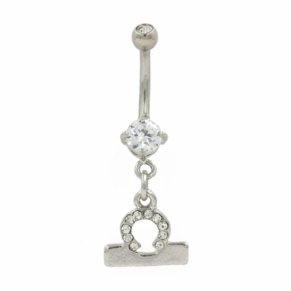 Kolczyk do pępka wykonany ze stali chirurgicznej 316L z wiszącą ozdobą przedstawiającą znak zodiaku WAGA.