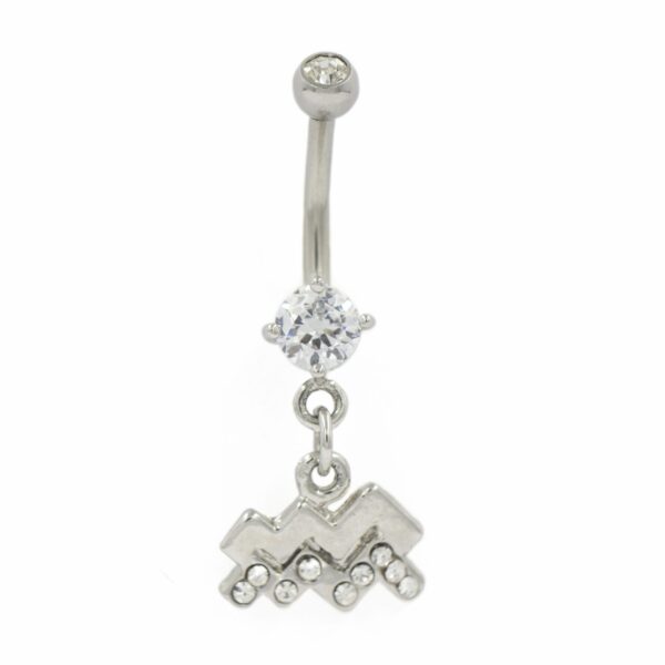 Kolczyk do pępka wykonany ze stali chirurgicznej 316L z wiszącą ozdobą przedstawiającą znak zodiaku WODNIK.