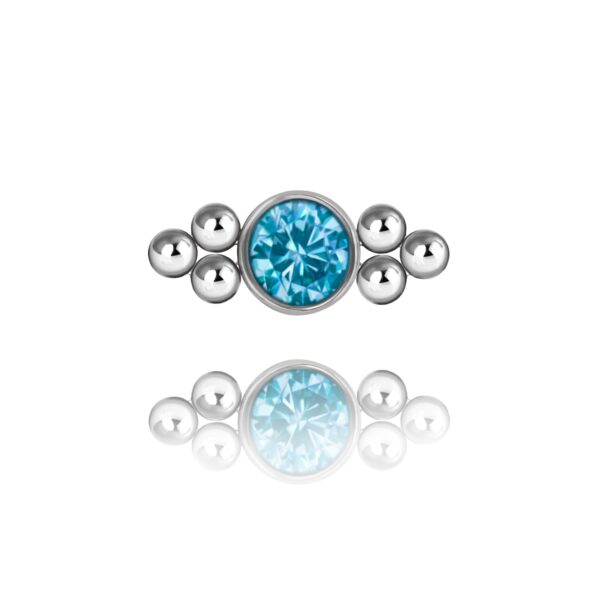 Nakrętka wykonana z tytanu ASTM F-136 , ręcznie polerowana. Ozdoba składa się z jednego kryształka w kolorze błękitnym oraz trzech tytanowych kuleczek po dwóch stronach.