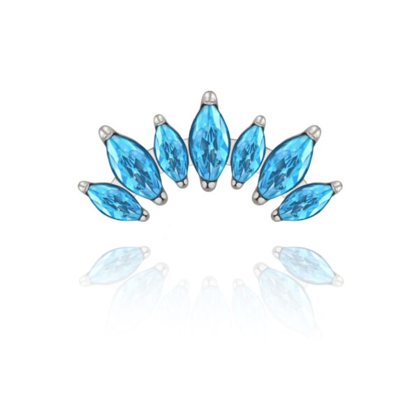 Nakrętka wykonana z tytanu ASTM F-136 , ręcznie polerowana. Ozdoba składa się z siedmiu kryształków w kolorze błękitnym.