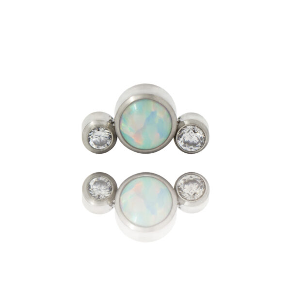 Nakrętka składa się z trzech oczek : środkowe 4 mm w kolorze jasnego opalitu oraz dwóch bezbarwnych po bokach o średnicy 2 mm.