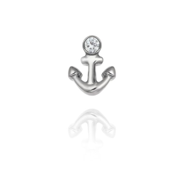 Nakrętka tytanowa w kształcie kotwicy z bezbarwnym kryształkiem 2,5 mm. Wykonana z tytanu wysokopolerowanego ASTM F136.