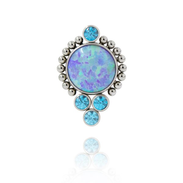 Nakrętka tytanowa z dużym niebieskim opalitem , czterema błękitnymi kryształkami oraz małymi tytanowymi kuleczkami po bokach , wykonana z tytanu wysokopolerowanego ASTM F136.