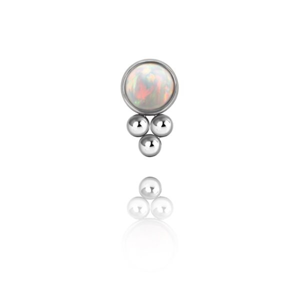 Nakrętka wykonana z tytanu ASTM F-136 , ręcznie polerowana. Ozdoba składa się z jednego białego opalitu oraz trzech tytanowych kuleczek.
