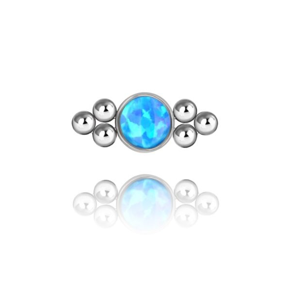 Nakrętka wykonana z tytanu ASTM F-136 , ręcznie polerowana. Ozdoba składa się z jednego niebieskiego opalitu oraz trzech tytanowych kuleczek po dwóch stronach.
