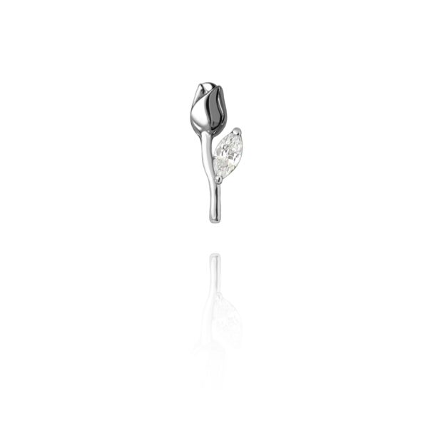 Nakrętka tytanowa w kształcie tulipana z małym bezbarwnym kryształkiem w kształcie listka, wykonana z tytanu wysokopolerowanego ASTM F136.