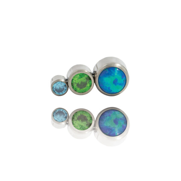 Nakrętka składa się z niebieskiego opalitu 4 mm, mniejszego zielonego kryształka 3 mm oraz błękitnego kryształka 2 mm.