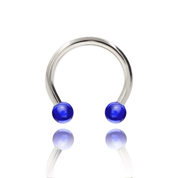 Podkowa wykonana ze stali chirurgicznej 316L z akrylowymi kulkami w kolorze niebieskim.
