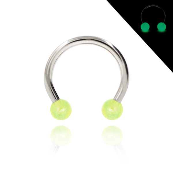 Podkowa wykonana ze stali chirurgicznej 316L z akrylowymi kulkami świecącymi w ciemności w kolorze jaskrawozielonym.