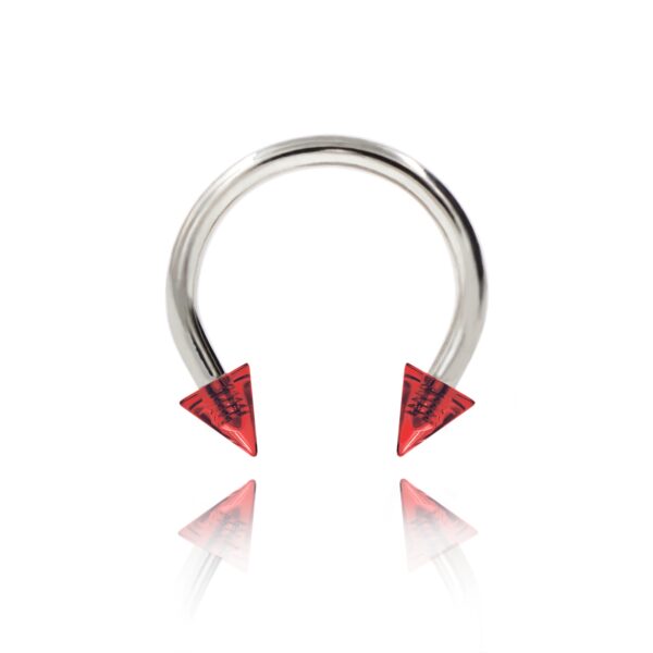 Podkowa wykonana ze stali chirurgicznej 316L ze stożkami akrylowymi w kolorze czerwonym.