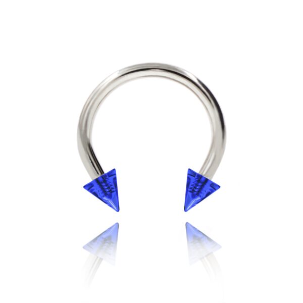 Podkowa wykonana ze stali chirurgicznej 316L ze stożkami akrylowymi w kolorze niebieskim.
