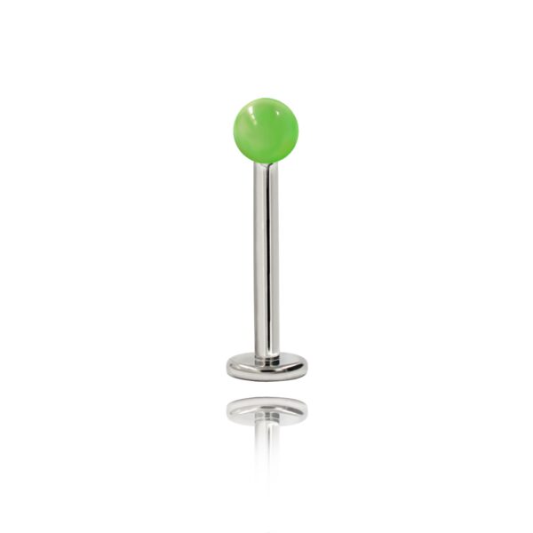 Labret wykonany ze stali chirurgicznej 316L z akrylową kulką w kolorze zielonym.