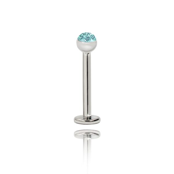 Labret wykonany ze stali chirurgicznej 316L z oczkiem, kryształkami Ferido w kolorze błękitnym.