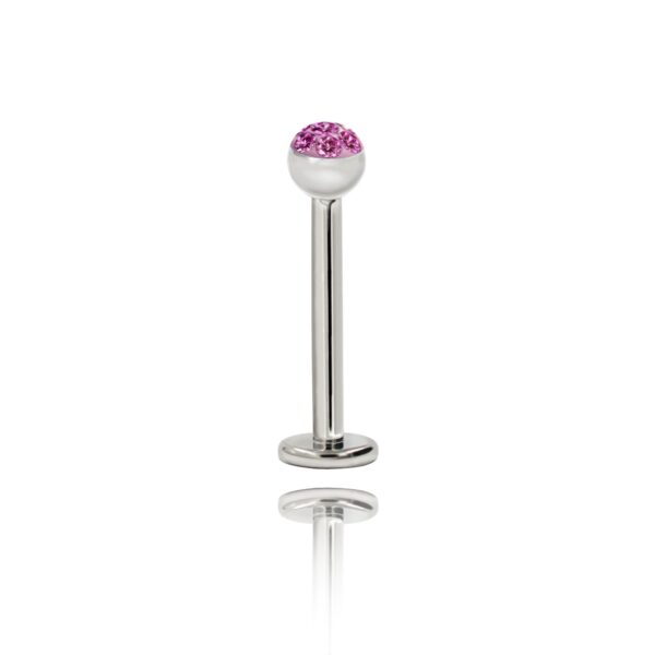 Labret wykonany ze stali chirurgicznej 316L z oczkiem, kryształkami Ferido w kolorze jasnoróżowym.