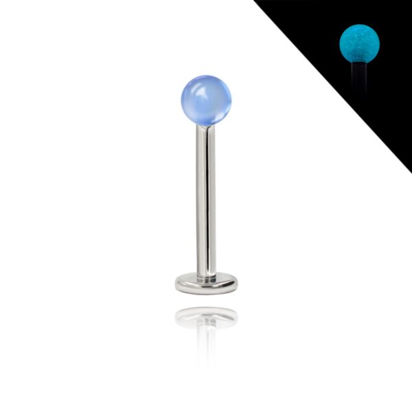 Labret wykonany ze stali chirurgicznej 316L z akrylową kulką świecącą w ciemności w kolorze niebieskim.